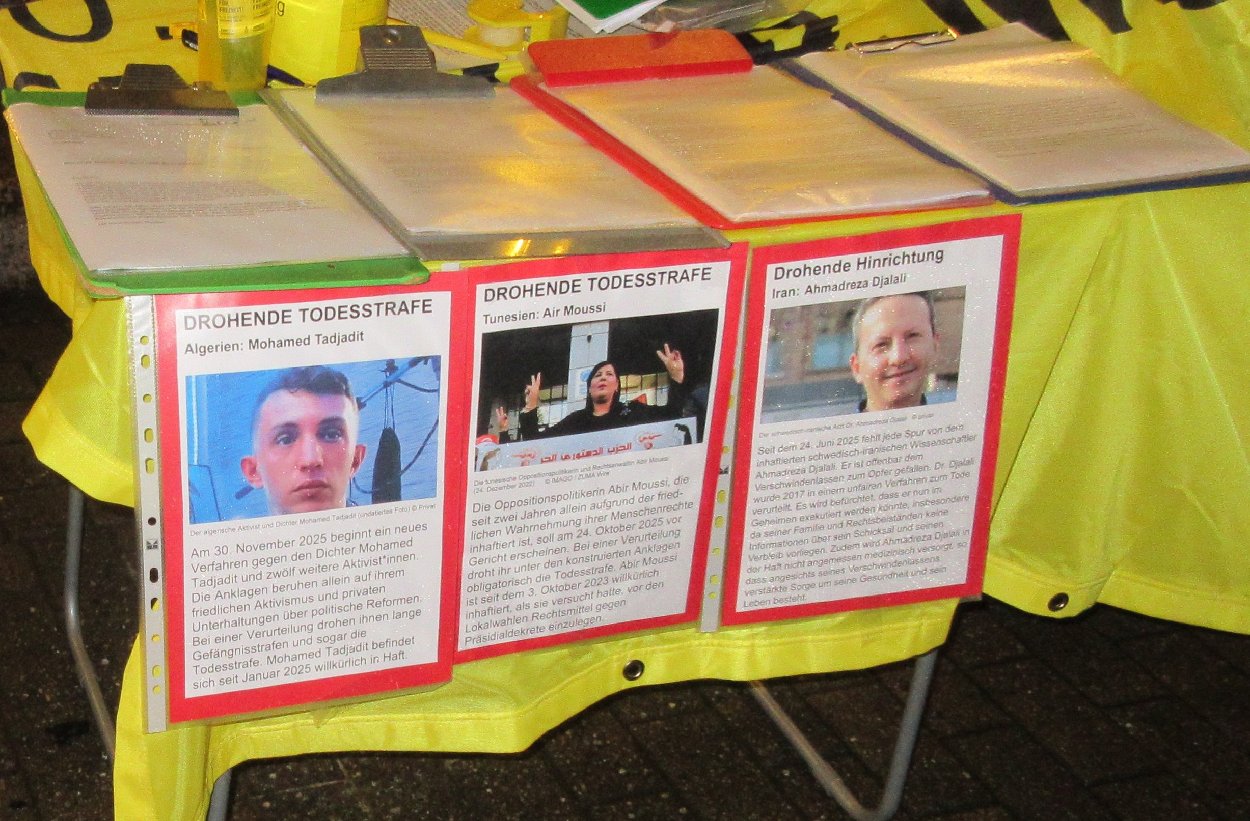 Aus Sicherheitsgründen konnte in diesem Jahr der Infostand dieser Aktion nicht am gewohnten Ort auf dem Weihnachtsmarkt, sondern nur in einer Seitenstraße stattfinden. Zudem war 1. Advent und es regnete in Strömen. Trotzdem konnten 66 Briefe versendet werden für Menschen, die von der Todesstrafe bedroht sind.